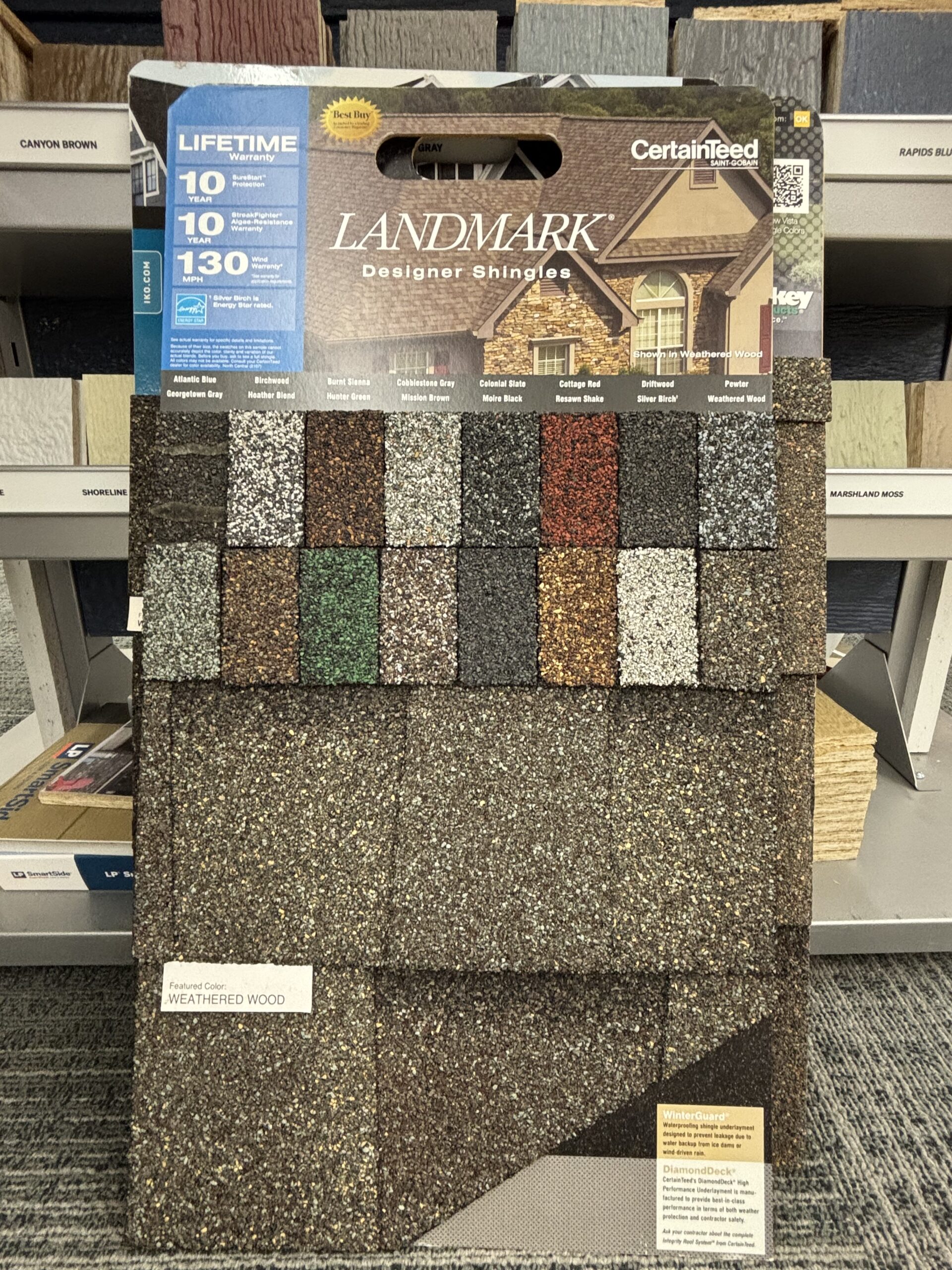 We offer James Hardie for our cement siding selection along with LP, Diamond Kote, and Expert Finish for our OSB siding. Visit our siding page here.